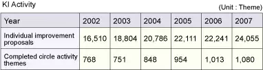 To "Improve the quality of work," the objective cited as one of the three pillars of GQM, we are driving KI (Kaizen & Innovation) activity. The KI activity is intended to harness synergy among the "fellow employees who respect one another," in keeping with our management philosophy, and thereby promote kaizen (improvement) and innovation. Each department sets its own theme for the improvement of work quality and presents the outcomes of efforts made under these themes, thus fostering a sense of competition that spurs the company-wide effort toward quality improvement. The KI Activity Presentation Conference is held in June and November of each year.