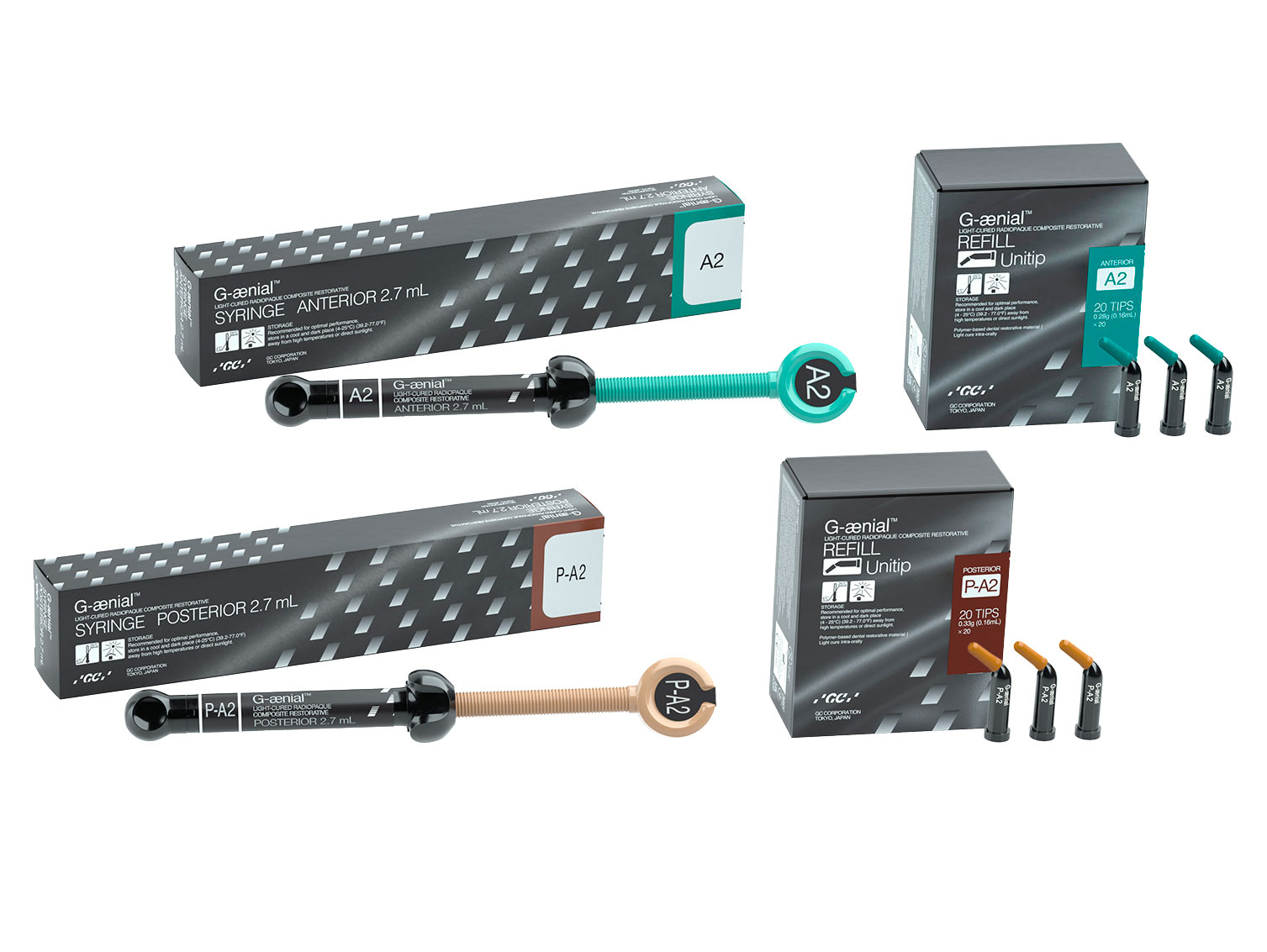 *G-ænial is a high strength, low shrinkage stress composite. Both Anterior and Posterior shades can have universal application (anterior shades can be used in posterior restorations and vice versa)