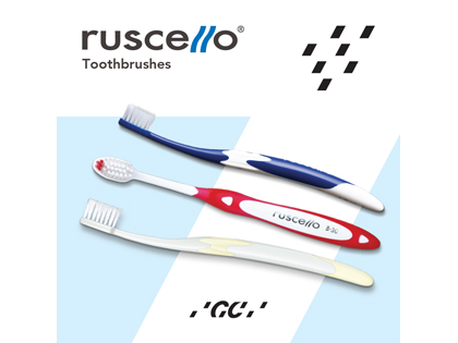 Ruscello Toothbrush range from GC, prescribed by the dental professional according to the patients oral condition and age. Ruscello toothbrushes feature an ergonomically shaped handle that provides a stable, comfortable grip and allows the brush to reach posterior and anterior teeth easily. Also featuring a range of head sizes and bristle orientation for a truly indivisualised approach.