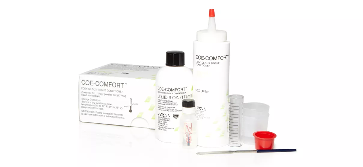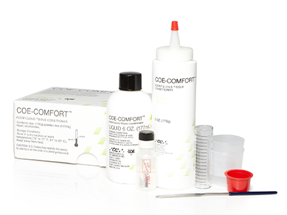 COE-COMFORT™ is a self-curing, chairside edentulous tissue conditioner used to restore sound form and condition to the underlying tissue. Acting as a cushion to the tissue, a lining of COE-COMFORT™ allows the denture-bearing tissue to recover and return to a normal, healthy condition.