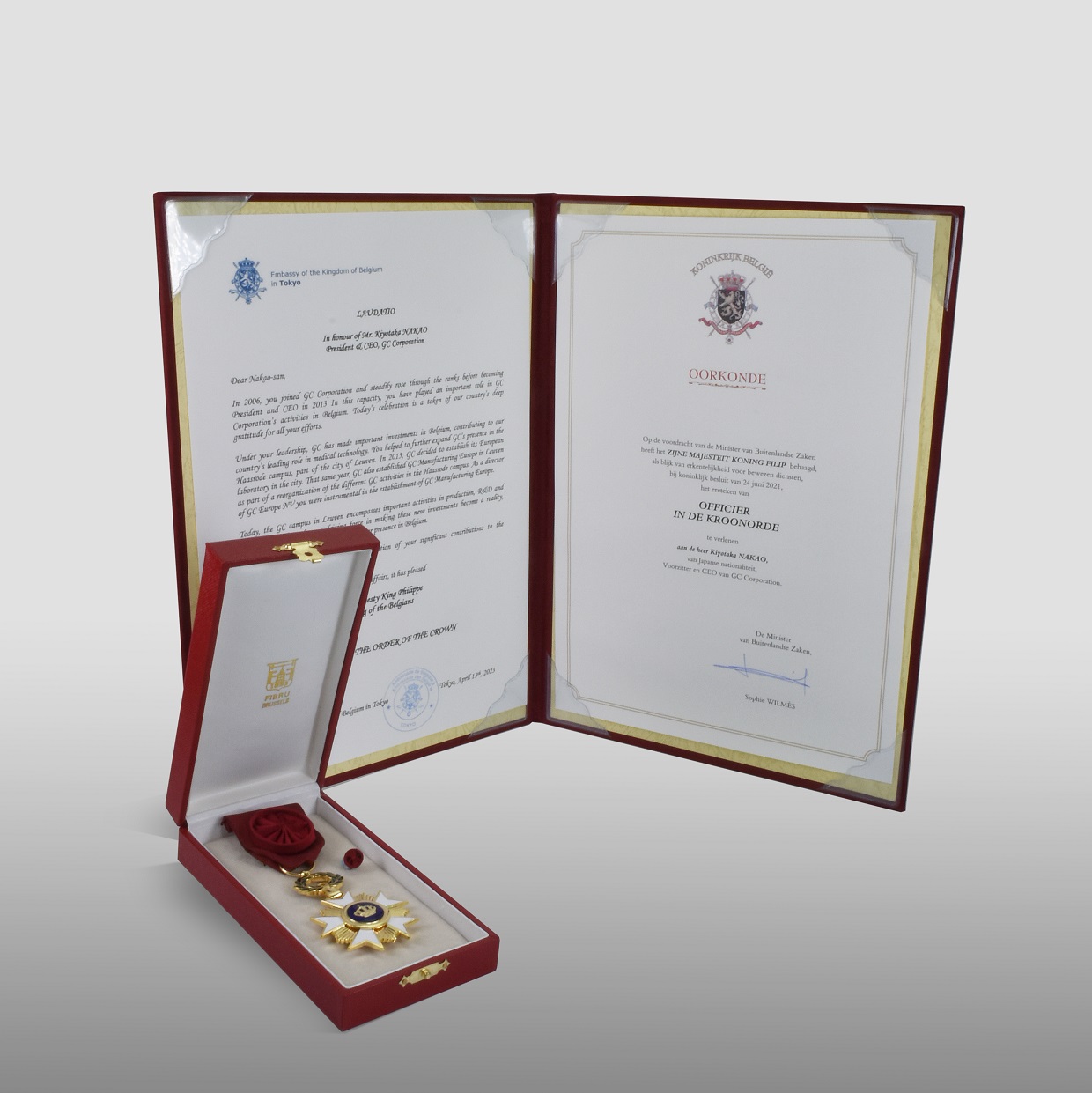 This is not the first time a member of GC has been honored with a rank in The Order of the Crown. Mr. Makoto Nakao, Chief Corporate Adviser of GC Corporation, was awarded the status of Commander in the Order of the Crown in 1995, and Dr. Nakao is honored to continue this legacy.