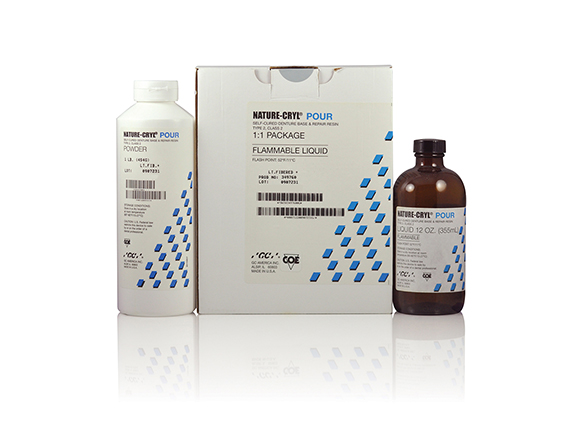 NATURE-CRYL® POUR is a pour-type, acrylic resin used to process complete or partial dentures. This product can also be used as a laboratory reline and repair material. NATURE-CRYL® POUR is quite versatile; it can be used in many techniques including fluid resin, invest with hydrocolloid or alginate, cured with curing units and can be used in the fabrication of orthodontic appliances, splints and mouth guards.