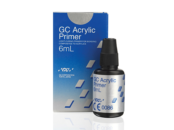 GC ACRYLIC PRIMER increases the adhesiveness of light-curing composites to conventional acrylic resins used in dental laboratory procedures like the modification of denture teeth or denture base resins.