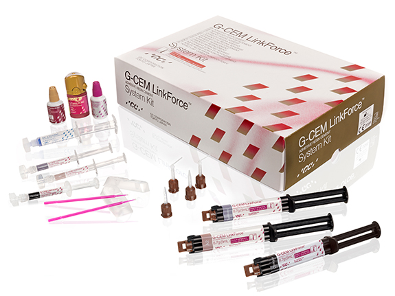 | 009541 | System Kit - Contains: Three G-CEM LinkForce® cement syringes (1 each of: A2, Translucent and Opaque; 8.7 g each), 45 GC Automix Tips, 5 GC Automix Endo Tip mixing tips with intraoral tip, 1 bottle G-Premio BOND™ (5 mL), 1 bottle G-Multi PRIMER™ (5 mL), 1 bottle G-Premio BOND™ Dual Cure Activator (3 mL), 1 syringe GC ETCHANT (3.6 mL; available in System Kit only), 25 Metal dispensing tips + 2 covers (for GC ETCHANT & Try-in Paste), 3 syringes G-CEM® Try-in Paste (A2, Translucent and Opaque; 1.5 g each), 50 disposable applicators and 20 disposable dispensing dishes. |