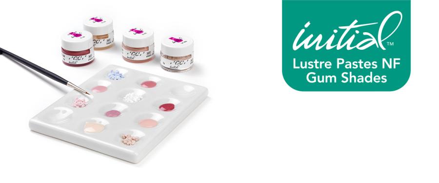 GC Initial IQ Lustre Pastes NF Gum Shades sind dreidimensional malbare Keramiken, die entwickelt wurden, um einen natürlichen Übergang von der Krone zur Gingiva nur durch Bemalen zu gestalten.