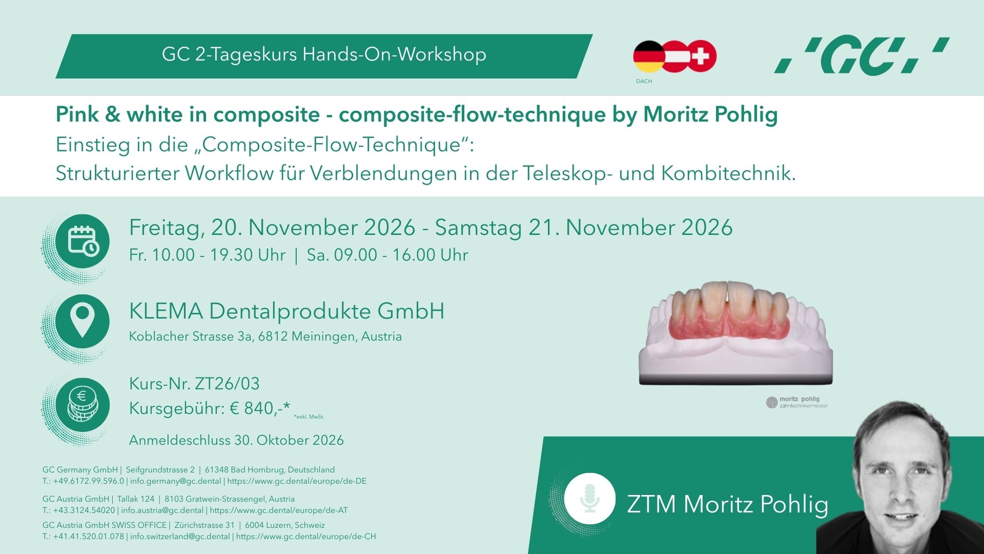 GC 2-Tageskurs GRADIA PLUS: „Pink & white in composite - composite-flow-technique by Moritz Pohlig“ mit ZTM Moritz Pohlig in Meiningen (AT) €840.00
