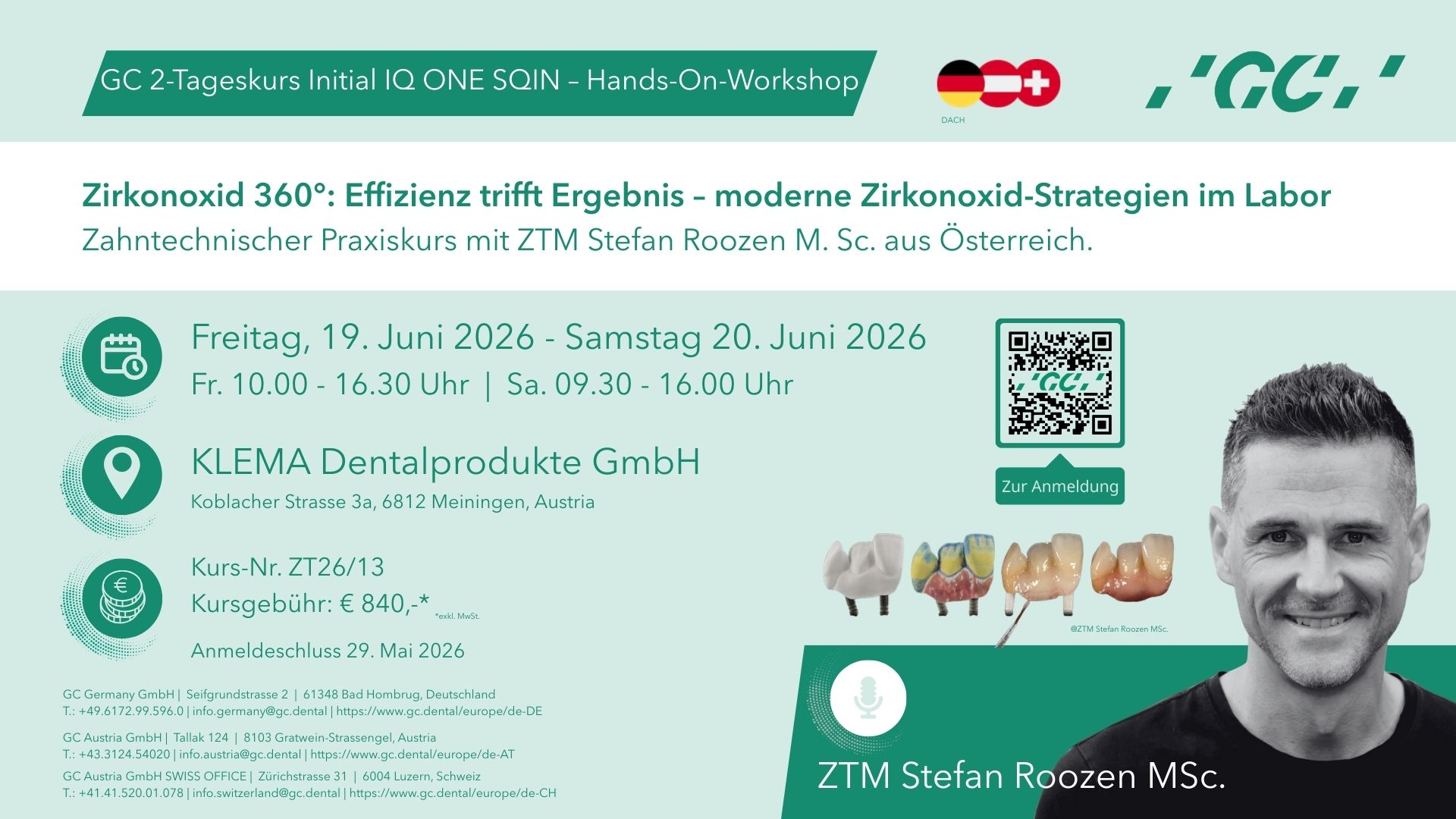GC 2-Tageskurs Initial IQ ONE SQIN – Hands-On-Workshop: "Zirkonoxid 360°: Effizienz trifft Ergebnis – moderne Zirkonoxid-Strategien im Labor" mit ZTM Stefan Roozen in Meiningen €840.00