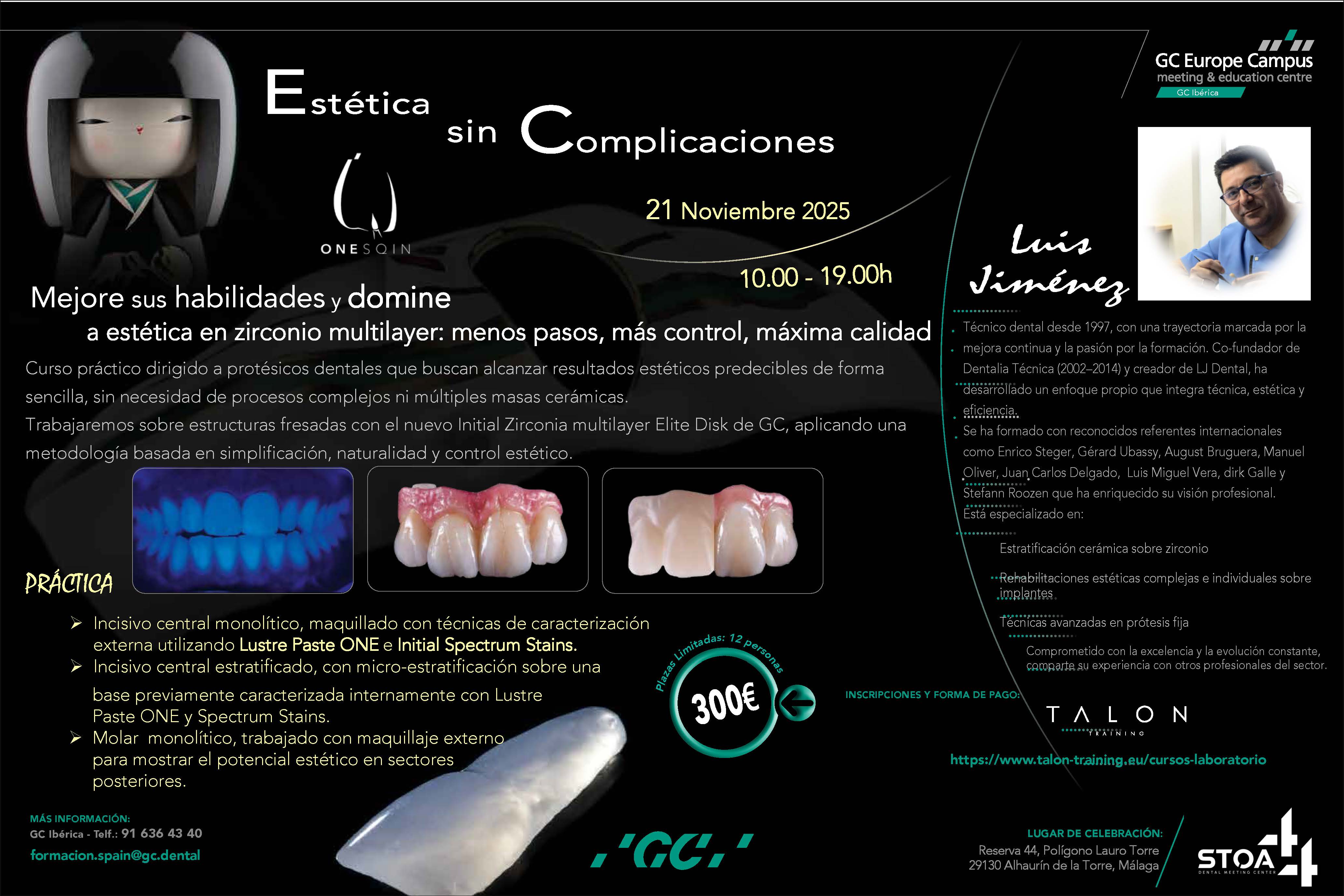 Curso práctico dirigido a protésicos dentales que buscan alcanzar resultados estéticos predecibles de forma sencilla, sin necesidad de procesos complejos ni múltiples masas cerámicas. Trabajaremos sobre estructuras fresadas con el nuevo Initial Zirconia multilayer Elite Disk de GC, aplicando una metodología basada en simplificación, naturalidad y control estético.