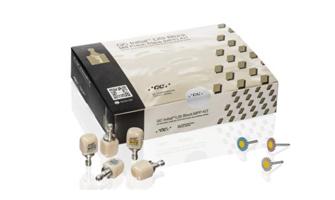 = CERASMART270 block storlek 14, CEREC (A2 HT x3; A2 LT x2, A3 HT x3, A3 LT x2), OPTIGLAZE Color in Clear HV, Clear, A Plus, Red Brown, White , G-Multi PRIMER