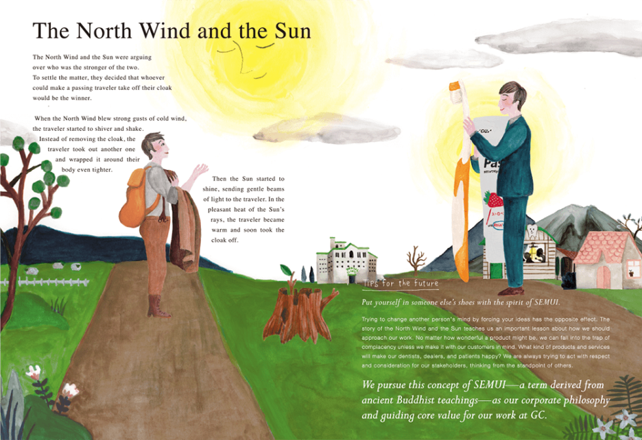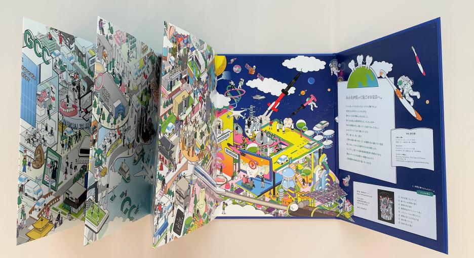 On the back, as an illustration of the near future, we expressed GC’s efforts made with products and services all around the world to realize oral health which should be essential in people’s life for “smiling,” “eating,” and “speaking”, hoping for a realization of a “healthy and happy world where everyone can smile.”