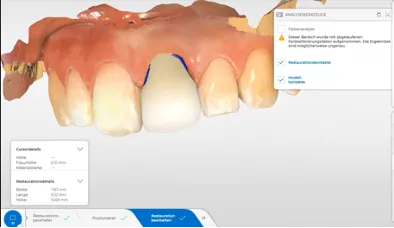 Under local anesthesia, the conservative measures were carried out on tooth 21. The old composite fillings were removed, carious areas eliminated and the tooth was built up (Fig. 3). After the follow-up preparation, the situation could be digitized using an intraoral scanner and the data were imported into the CAD software. The construction of the fully anatomical crown 21 was based on the automatic design proposal (Fig. 4). In the software, fine adaptations of shape, surface and texture as well as the control of the functional conditions were carried out. Then the crown was milled from Initial LiSi Block. The ceramic can be milled quickly. Within a short time, the crown was ready. And while with a conventional lithium disilicate the final material properties are achieved by the additional crystallization firing, Initial LiSi Block is already industrially completely crystallized. Hence, an additional crystallization fire is omitted.