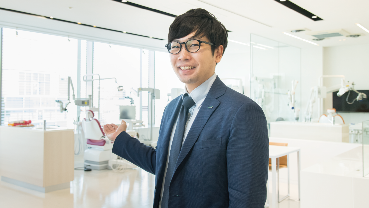 現在は機械営業として、東京23区外の7~8市を受け持ち、120件ほどの歯科医院を担当しています。主な取り扱い製品としては、歯科用ユニット、レントゲン、マイクロスコープ(歯科用顕微鏡)などが挙げられます。