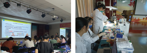 そこで、我々は「広西小児歯科聯盟」という、予防/小児歯科のレベルアップを目的とした勉強会に協賛する形で、2022年6月21日~22日と9月6日~7日の2回コースのお手伝いをしました。延べ75名の歯科医師の参加があり、予防/小児歯科において、重要な役割を担う歯科衛生士という制度がない中国において、効率よく診療できる製品の提案を行いました。先生方との交流を通して、この分野における情報不足を痛感し、今後も継続して教育支援を行っていくことをお約束しました。