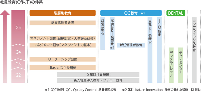 ジーシーでは、仕事を通じて必要な知識を覚えていく「OJT」(On the Job Training)以外に「Off-JT」としてさまざまな教育制度や研修体制を設けています。