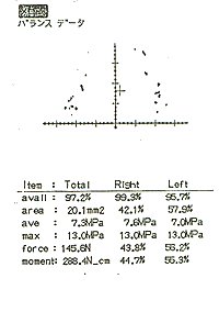 | A:咀嚼訓練前 B:咀嚼訓練後 1:咬合面積、咬合力、平均咬合圧力 2:左右の咬合バランス |