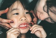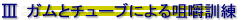 噛ませる試料の厚さを1.5mmから3.5mmと変化させると咀嚼筋は試料が厚いほど筋活動量も大きくなると報告されている。 訓練には水槽に用いる直径約6mmのエアーチューブを使用する。チューブは左右の第一小臼歯に当てて訓練時間は1日10分2回の訓練を原則としている。チューブにワイヤーを通して、馬蹄形に形成すると操作がしやすくなる(写真6)。 咬合バランスに差がある場合はガムの訓練と同様にチューブを直線にして、咬合力の減少している側で噛む訓練をする。 咀嚼訓練の際には、下顎角前方の咬筋の付着部位と、こめかみの前方の側頭筋の付着部位を指で触りながら、筋肉の活動量と左右差が生じていないかを確認する。子供の場合には保護者が確認する(写真7)。咬合力の減少している場合はこれらの触診は微弱である。 |