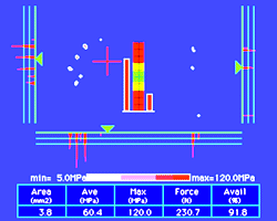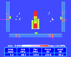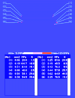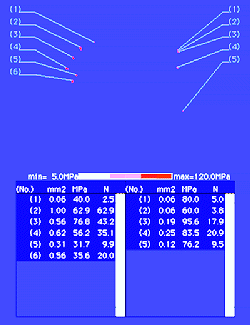 1-2 アイランドのデータをプリントアウトして実際の上部構造の上にあてがい、左右のバランス、接触点の面積、個々の接触点の咬合力を調整した後のデータ。 |