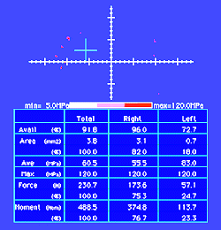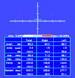 | 1-1 通法により、咬合紙と咬合調整用ワックスで調整を行った後採得したデンタルプレスケールのデータ。この時点で、患者さんは違和感を訴えることはなかった。 |