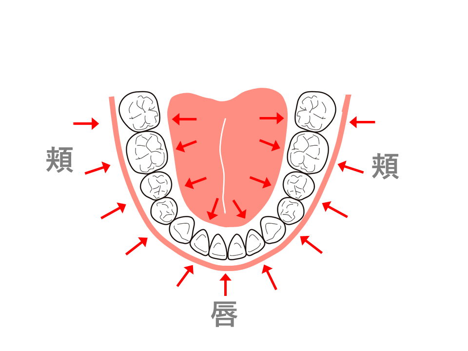 口元のかたちや歯が生える場所は歯や唇、舌、頬の筋肉が互いに押し合いながら、絶妙な力のバランスで決まってゆきます。歯並びだけでなく 口元や顔つきも変化させます