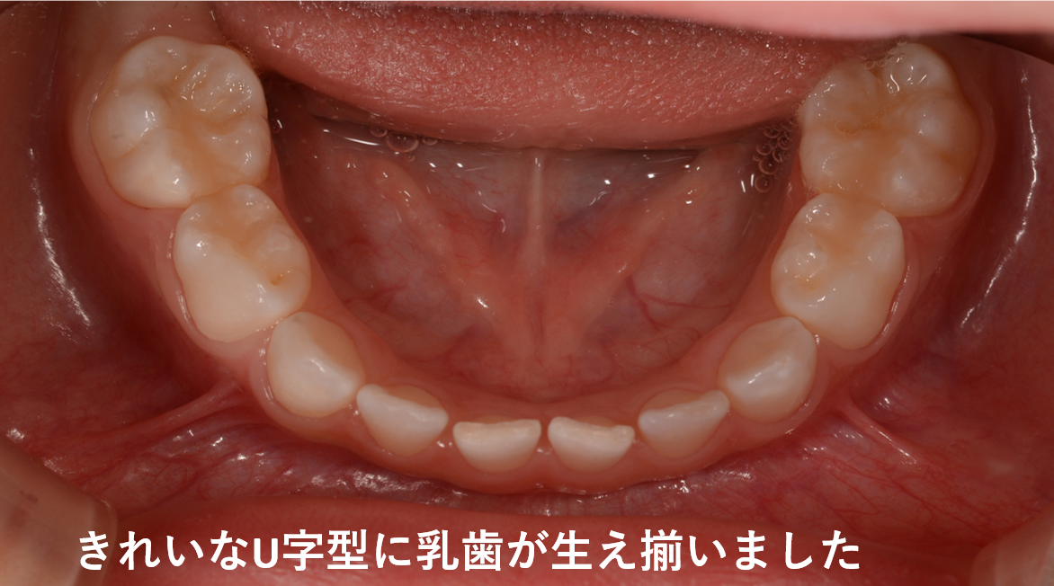 このバランスによって、離乳期を通して食べる機能を正しく身につけてゆければ、乳歯は自然にきれいなU字型に生え揃います。きれいな歯並びは食べることが上手で発音にも適しています。