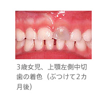 pic 09歯をぶつけた後、色が変わってくるのは、歯中央の軟組織である歯髄が変性したことをあらわします。ただし、ぶつけた直後と2,3カ月以降におこる変色では意味合いが異なります。ぶつけた直後の淡い変色は、いわば歯髄の内出血と考えてよく、多くの場合自然に消退していきます。これに対して、2,3カ月以降に観察されてくる灰褐色の着色(写真参照)は、歯髄の活性が徐々に失われ歯髄死に至る(失活)兆候を示します。歯髄壊死により、根尖周囲の歯肉が赤く腫れたり膿をもったりもします。