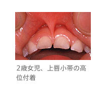 上唇の裏側の長い筋は、口腔粘膜の一部が歯肉に付着するひだであり、上唇小帯と呼ばれます。乳児期の上唇小帯は相対的に太く、上顎乳切歯が萌出した頃では、左右中切歯間の歯肉の位置まで付着部位が伸びていることがあります(高位付着、写真参照)。その後、歯槽骨の水平的な発育は乳臼歯の萌出が完了すると微々たるものとなりますが、垂直的な発育は幼児期を通じてゆっくりと続き、上唇小帯の付着部位は徐々に上がって歯から離れていくのが一般的です。