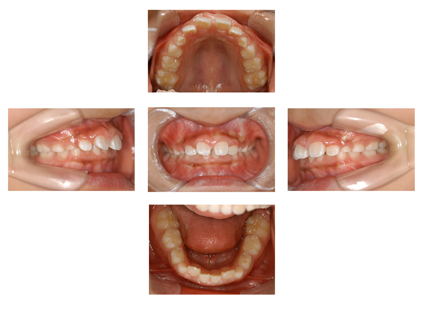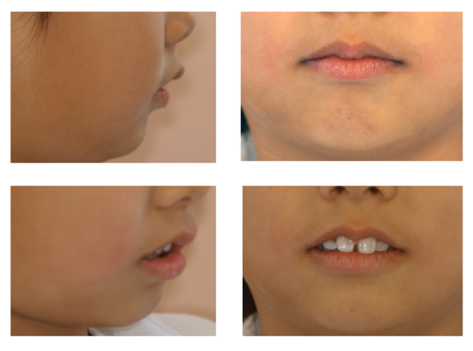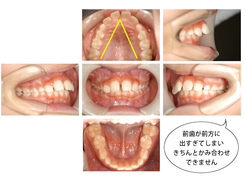 この場合には、歯並びの治療(矯正治療)を先行して行い、それと並行して口を閉じる訓練を行います。(図10、11 上顎前突)