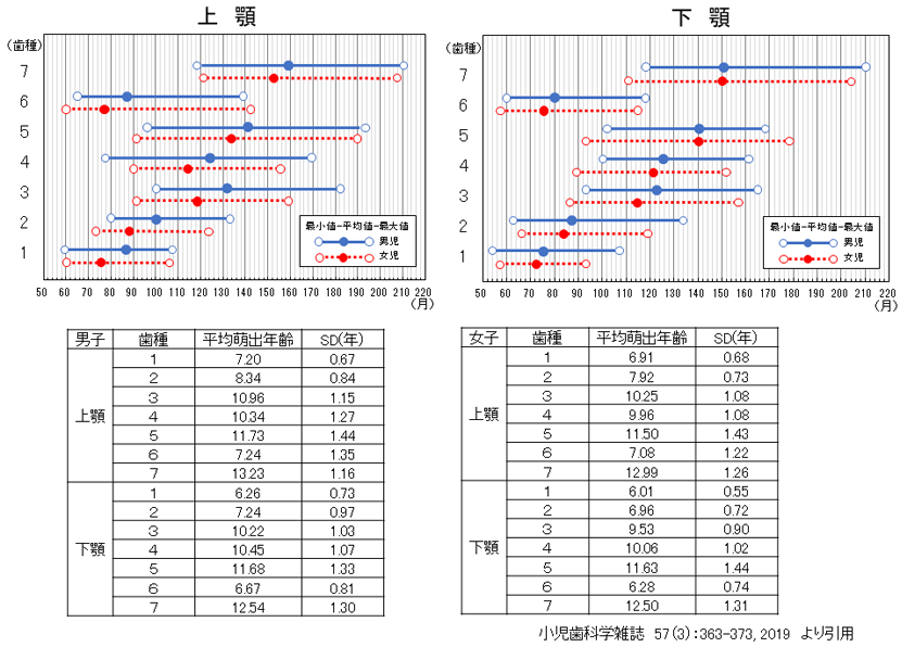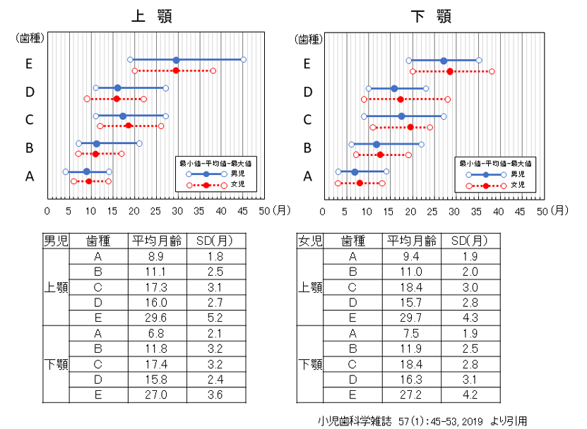 日本小児歯科学会で実施した日本人の子どもの歯の生える時期に関する全国調査の結果からも、子ども歯の生える時期には大きな個人差があることがわかります(図16 乳歯列、図17 乳歯萌出開始時期、図18 永久歯列、図19 永久歯萌出開始時期)。