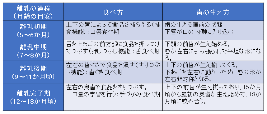 人間は他の哺乳類の動物と同様に、生後すぐに母乳や哺乳瓶でミルクを飲むことができます。これは哺乳類における反射運動であり、学習せずに乳首から母乳を吸い出して飲み込むことができます。一方、固形の食品を噛みきり、奥歯ですりつぶしながら唾液とともに食塊として飲み込むことは自然にはできるようになりません。最初の前歯が生え始めの時期から始まる「離乳」という学習過程が必要です。そして離乳が完了するのは最初の奥歯が生えて咬み合う1歳半頃になります。その間、子どもは離乳の過程で以下のような順序で食べる機能を学習していきます(表1)。