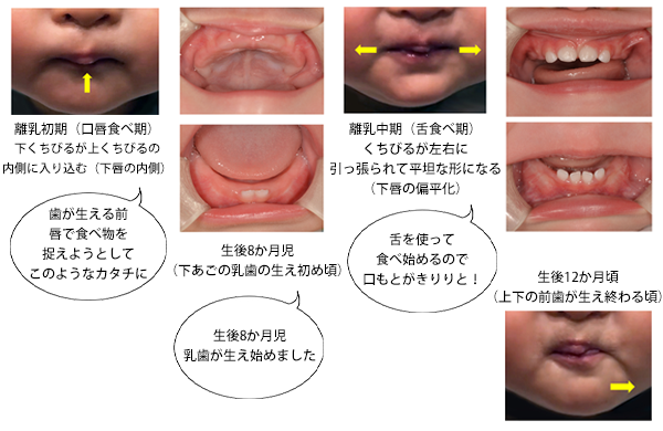 - (1)乳児期の終わり(12か月頃)頃に上下の乳歯の前歯8本が生え揃い、上あごと下あごの間に舌の先端を差し込んだ状態の飲み込み方(乳児型嚥下)から、上下の歯を噛み合わせて舌を上あごに押しつけた状態で飲み込む(成熟型嚥下)への移行を開始します。