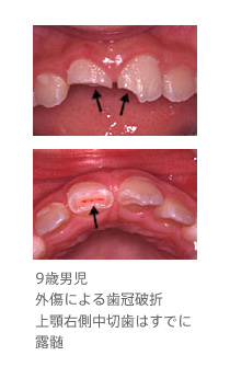 一方、破折した部位からピンク色に歯髄(歯の神経)が透き通っていたり、すでに出血している(露髄=ろずい)場合には、歯髄の一部を滅菌下で除去し薬剤を貼付してから(部分的生活歯髄切断法)、同様に歯の形を修復します。こどもの場合は永久歯が萌出しても3年以内は、歯髄組織に誘導される歯根形成(歯の根の成長)が持続しており、歯髄の完全除去は好ましくありません。受傷してから1日以内であれば、破折した露髄面から細菌が歯髄の深部にまで感染していることはなく、部分的生活歯髄切断法は極めて高い成功率が期待できます。