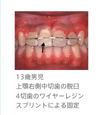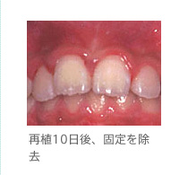うです(1週間から10日)。歯根膜が生着しないと歯根は直接歯槽骨と癒着し、再植歯と隣りの歯との高さが年々違ってきます。また、著しい歯根吸収をおこし1,2年以内に抜去せざるを得ない場合もあります。しかし、歯列咬合の成長期に、入れ歯などでなく自前の歯で過ごせることは子どもにとって福音であり、再植の意義は極めて高いといえます。