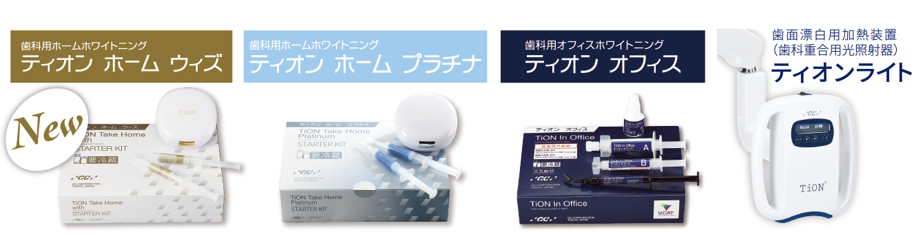 医薬品含有歯科用歯面清掃補助材 ティオン ホーム ウィズ 高度管理医療機器 30600BZX00056000 医薬品含有歯科用歯面清掃補助材 ティオン ホーム プラチナ 高度管理医療機器 22900BZX00205000 歯科用漂白材 ティオン オフィス 高度管理医療機器 22200BZX00785000 歯面漂白用加熱装置(歯科重合用光照射器) ティオンライト 一般医療機器 特定保守管理医療機器 13B1X00155000312