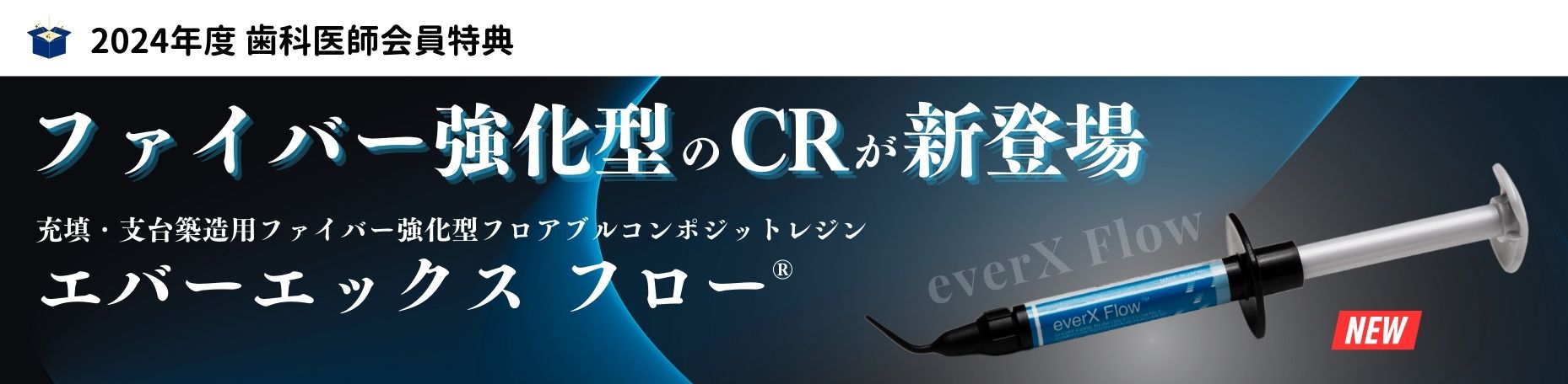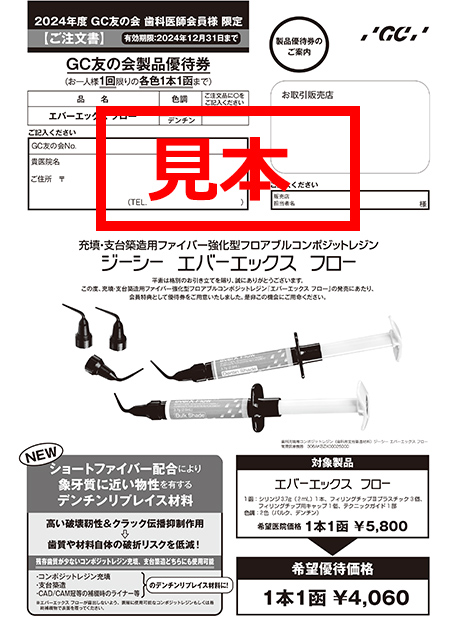 【GC友の会 歯科医師会員様 限定】 「エバーエックス フロー」 製品優待券のご案内 有効期限:2024年12月31日まで 歯科医師会員の皆さまに、新製品特典と併せて製品優待券をお届けしております。 ※お一人様1回限り/各色1本1函まで ~ご注文方法~ 新製品特典と併せてお届けしている製品優待券に必要事項をご記入いただき、お取り引き販売店様にお渡しください。 製品情報はこちら