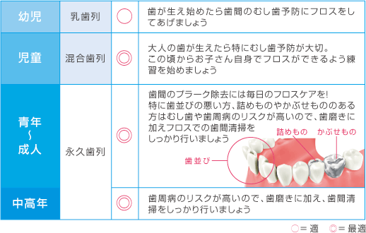 - デンタルフロスとは、歯ブラシでは届かない狭い歯間を清掃できる、糸状の清掃用具です。歯ブラシによるブラッシングでは、歯間や歯周ポケット(歯と歯肉の間の溝)までブラシが行き届かず、プラーク※を取り残してしまいます。プラークをそのままにしておくと、むし歯や歯周病の原因に。歯や歯肉を健康に保つためには、毎日のブラッシングとあわせて、デンタルフロスによる歯間のケアが大切です。