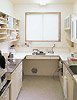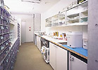 主に壁面利用の片側タイプと部屋に仕切ったコの字タイプがあります。ここでは立仕事が多いので、作業台は疲れない高さの 850〜900mm を基準にします。オートクレーブや自動現像器、又は冷蔵庫等を配置する場合は、事前に設置位置を決めて設計します。