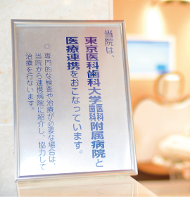 岸川先生の出身校である東京医科歯科大学との連携がとられている。難症例の対応にも万全が期されている。