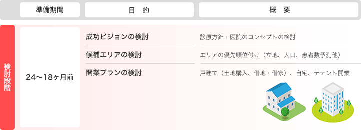 開業準備品リストの作成、開業コンサルタント、金融機関、開業地・設計・建築業者の見積もり依頼・決定へと準備が必要です。