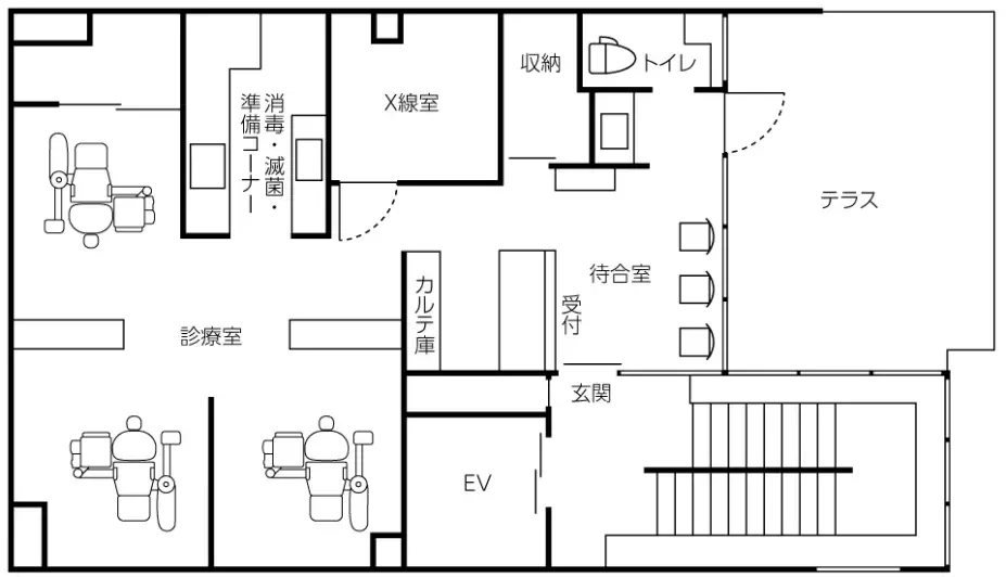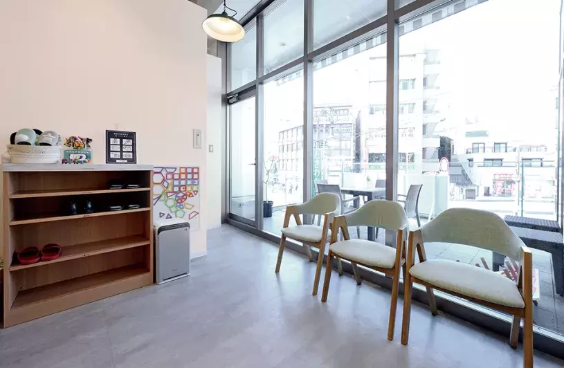 開業した場所は、前はブックカフェだったテラス付きの2階テナント。駅近で人通りが多いことと、視認性の高さが決め手となった。患者さんがリラックスできるよう、診療ブースは広めの作りで、圧迫感なく話しやすい環境を提供できるようになっている。実際、院内に入ってみると開放感があり、無駄のない動線が気持ち良く感じられる。