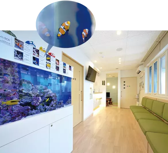 不安を抱えて医院にやってくる患者さんが少しでもリラックスできるようにと、エントランスには熱帯魚の水槽を設置。また、ユニットに座ったときに窓から植木の緑が見えるように設計した。