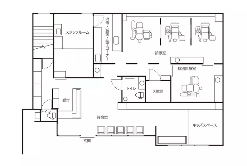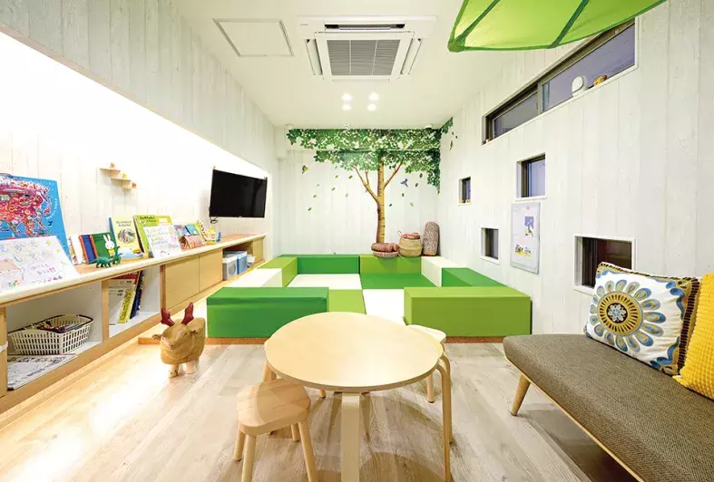 医院の設計において特にこだわったのは、キッズスペースとスタッフルームだという。キッズスペースは待合室側から区切り、子供が思い切り遊べる広さを確保。治療の前後でお子さんや保護者の方がリラックスできる場となっている。また、スタッフルームもスペースを大きくとり、一部を畳張りにしてスタッフがしっかりくつろげるようにしている。