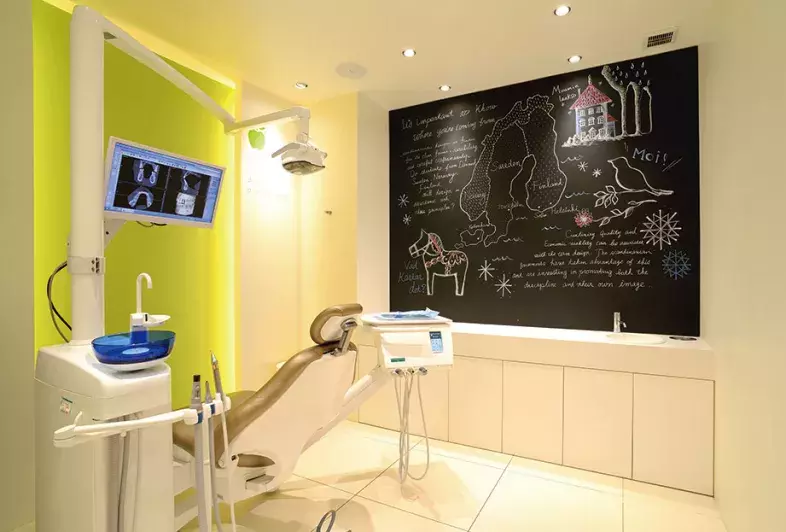 5つの診療ブースにアクセスする通路は、まさに温かい光のワンダーランドである。暖色系の間接照明が通路、診療室を照らし北欧の街を作り上げる。ユニットは、フィンランドに本社があるプランメカ社のGコンパクトiが設置されている。さらに奥の個室には、壁の黒板キャンバスに北欧をモチーフにしたフリーハンドのイラストレーションが描かれている。それを見ているだけでもタイムトリップできる。