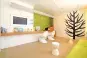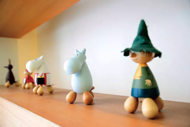 広い待合室の壁には森をイメージしたイラストと、ムーミンの世界が北欧家具とともに展開される。