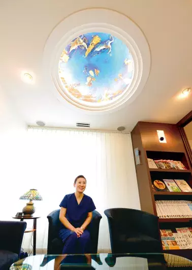 ※ラウンジと待合室との天井には中国人画家・江源の絵画が飾られている。「患者さんは診療前後に、スタッフは診療の合間に絵を見ることで心が落ち着くんですよ」と林先生。