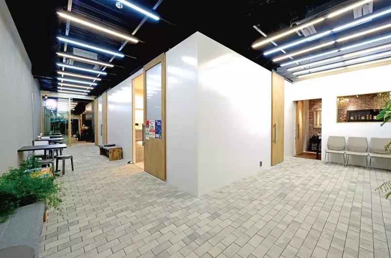エントランスを抜けると目に付くのは、テーブルやベンチが並ぶオープンカフェのようなL字型のスペース。受付や診療室などのエリアは白い壁で分断されており、一見では歯科医院には見えない。また、奥のテナントには実際のカフェが入っている。