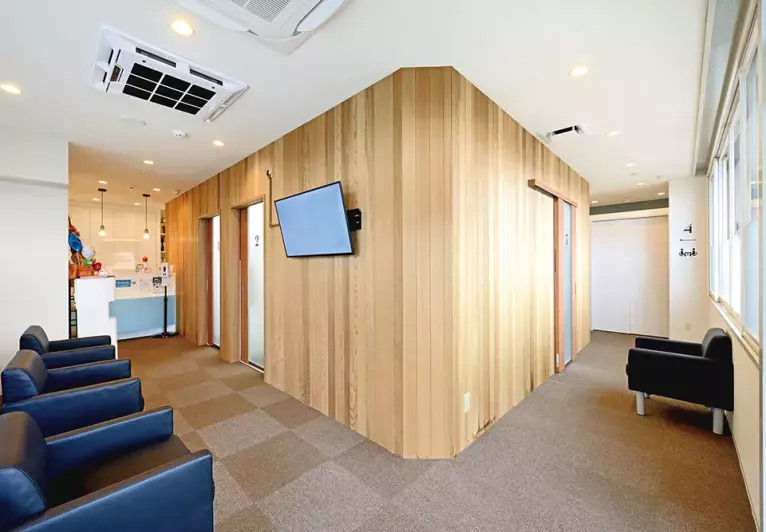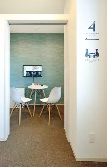 テナントの限られたスペースを最大限に活かすため、医院の設計にはこだわり抜いたという。4台のユニットを置くこと、患者さんとスタッフの動線を分離すること、という2つのコンセプトがあり、結果バックヤードを中心に放射状に4台のユニットを配置する院内レイアウトになった。