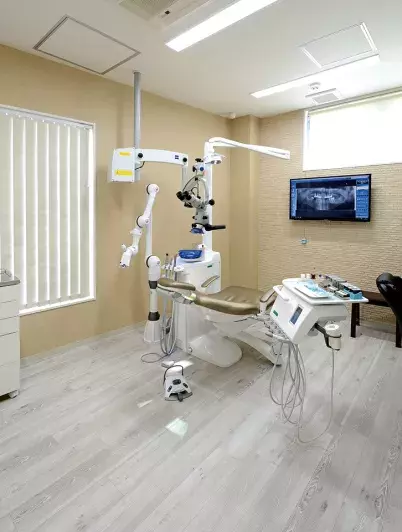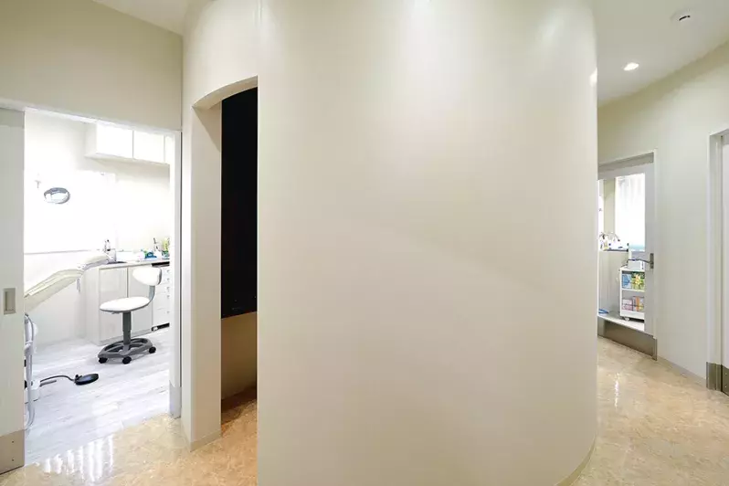 院内の中央に円形の受付があり、左側が2つの治療空間、右側にメインテナンス空間が設けられている。そのすべてが個室仕様で、メインの診療室にはカールツァイスの手術顕微鏡OPMI picoが天井マウントタイプで備えられ、ユニットはプランメカ社のGコンパクトiタッチが設置されている。一方、メインテナンス空間にはマッサージ機能搭載のルアーナが導入されている。