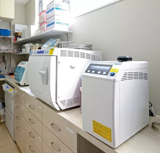 院内に設置されている大型機器はほとんどがジーシー製品である。X線はプランメカ社のプロマックス 3D Plus、消毒コーナーにはウォッシャーディスインフェクターのメラサーム10とクラスB滅菌器バキュクレーブ31B+が導入されている。