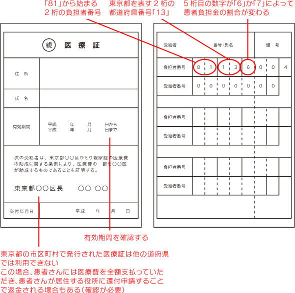 医療保険(社会保険、国民健康保険)優先で、患者負担分から一部負担金(下記全額)を差し引いた額を公費で助成 ・5桁目の数字が「6」の方(住民税課税世帯) 1割(上限 18,000円/1ヶ月) ・5桁目の数字が「7」の方(住民税非課税世帯) 患者負担なし |