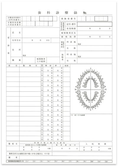 カルテ(歯科診療録)とは、治療の内容を書き留めておく記録用紙で、診療報酬請求を行ったり、医療行為の内容を証明するためにも使用する大切な書類です。